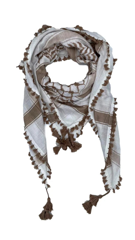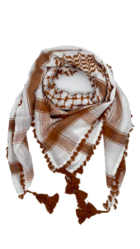 The White X Café Palestinian Keffiyeh – Old Town Stone Edition is inspired by the light stone walls and narrow streets of old cities in Palestine. A crisp white base is woven with warm café-brown patterns and tassels, giving you a fresh, minimalist look that’s still deeply rooted in heritage.