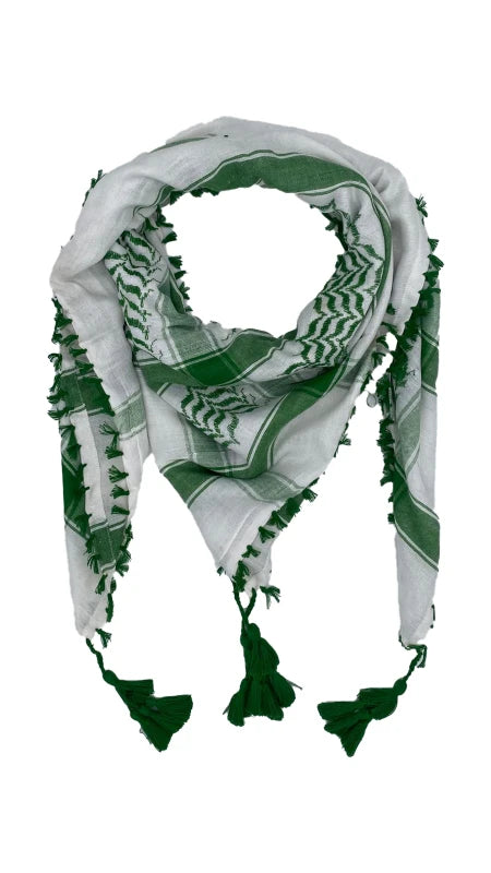 The bright green and white palette makes this keffiyeh stand out while staying easy to match: